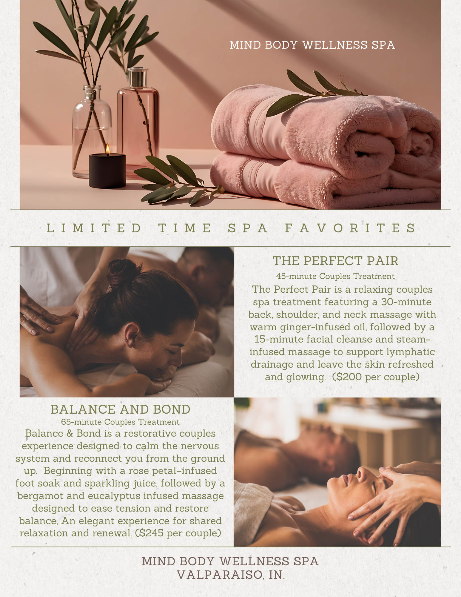 Located in beautiful Valparaiso, Indiana, MIND BODY offers a haven of tranquility to escape the hustle and bustle of everyday life. Specializing in a full selection of massage therapy and couples treatments along with a full-service Beauty Bar providing services such as facials, spray tans, and waxing.